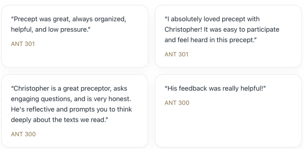 At Princeton, I have had the pleasure to guest lecture across departments, work as a Writing Center Fellow in the Writing Program, and serve as Assistant Instructor for the following courses: